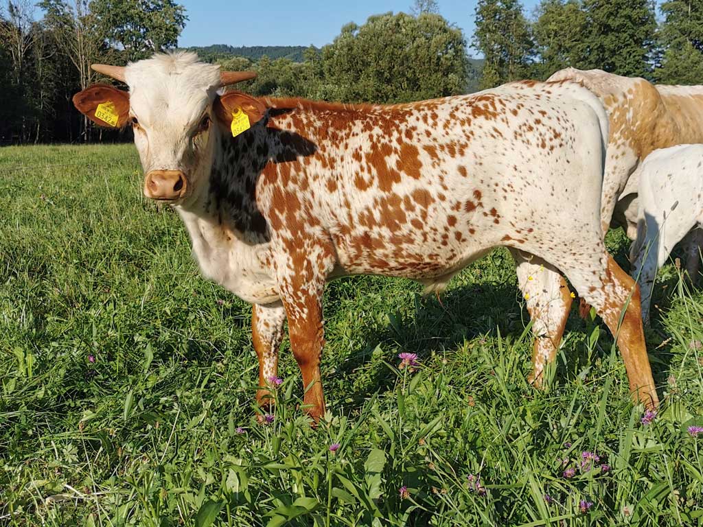 „Spotted Bandit“ ist ein Sohn von Silencer. Sehr bekannte und viel bestätigte Genetik für Fleisch, Farbe und auch Horn. Seine Mutter Spotted Cowgirl Chex ist unsere Top Zuchtkuh mit fast 2 Meter Hornlänge. Er passt perfekt zu unserem Zuchtverständnis.